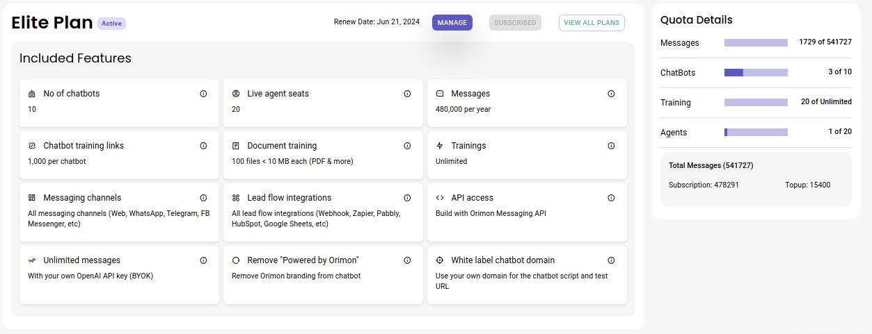 Add-ons are additional quota additions for various features of your OrimonAI account, such as **Messages** or **Live Agent** seats, should you need more.