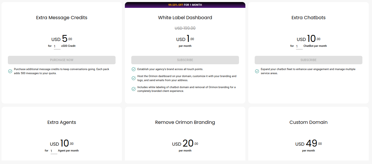 These may also be entire features that are available in the form of one-time purchases, such as **Custom Domain** or **Remove Orimon Branding**.