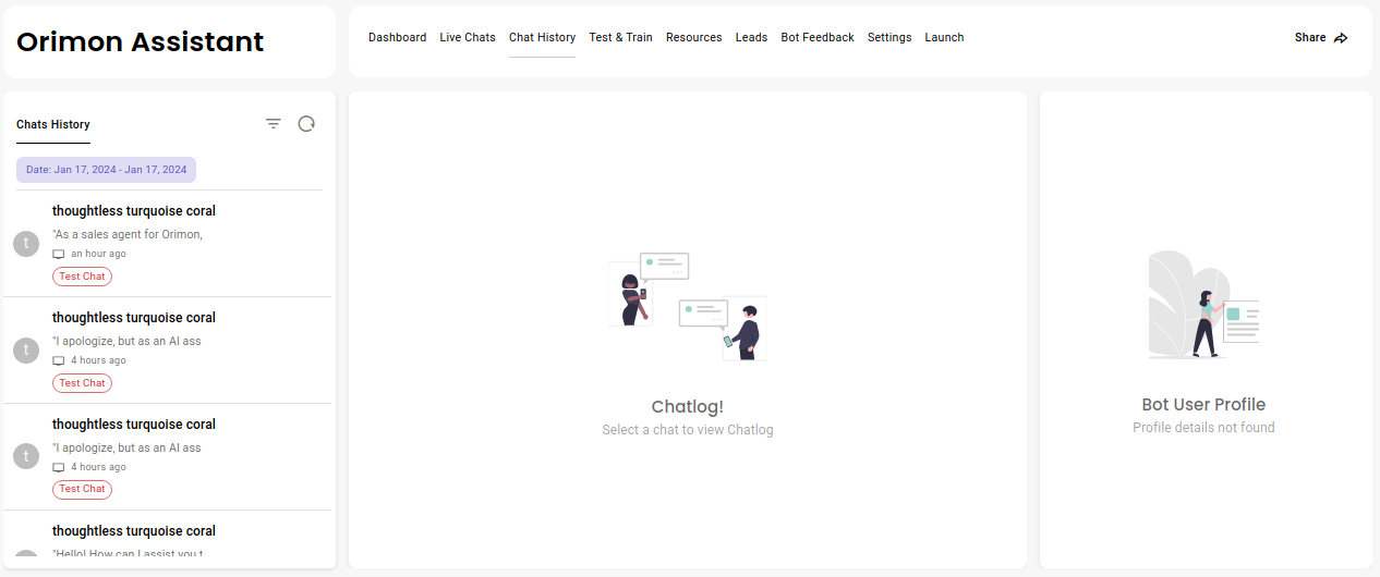 You can monitor all active conversations with you Chat-bot by logging in to your [dashboard](https://orimon.ai/login) -> bot overview page -> Chat History
