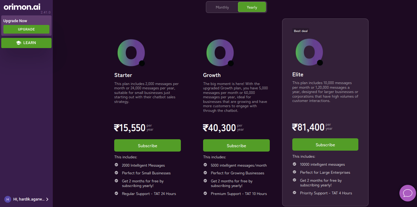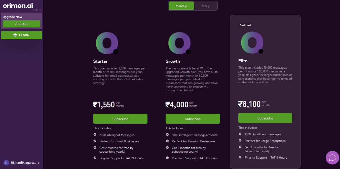 There are two types of subscription plans: monthly and yearly. Each subscription plan has three subcategories: Starter, Growth, and Elite. The Starter plan comes with 2000 messages per month, Growth comes with 5000 messages per month, and Elite comes with 10000 messages per month.